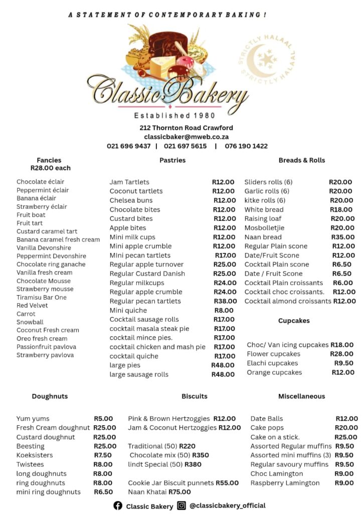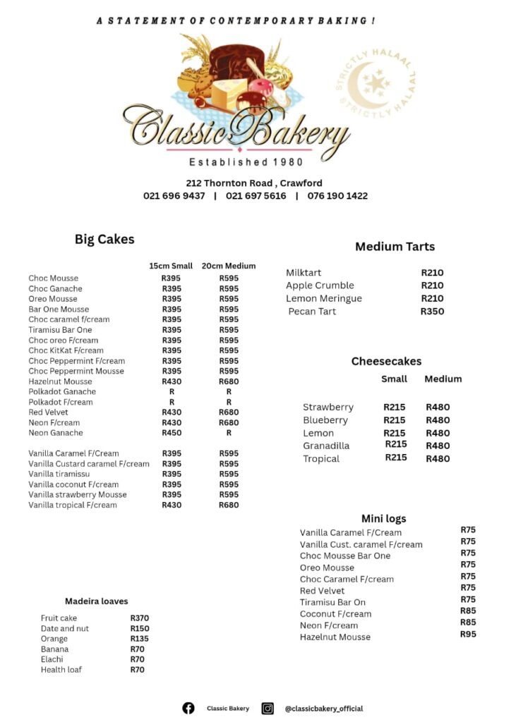 Posted on Kash Adams13/11/2021Trustindex verifies that the original source of the review is Google. Cake is absolutely lovely. Freshly baked daily. Quite unique cakes that you don't find at other bakeries.Posted on Abdullatief Wentzel06/11/2021Trustindex verifies that the original source of the review is Google. The quality is top notch and the flavours are consistentPosted on Ayesha Bibi Achmat04/11/2021Trustindex verifies that the original source of the review is Google. Keep up the good quality..keep down the prices best baked cakes ever๐Posted on insaaf nolan26/10/2021Trustindex verifies that the original source of the review is Google. Classic Bakery did it again. Super awesome delicious birthday cake for my boy. Shukran so much for only delivering excellence and making our kids birthdays extra special. Never disappointedPosted on Tashreeq Cassim19/10/2021Trustindex verifies that the original source of the review is Google. Delicious ๐Google rating score: 4.4 of 5, based on 517 reviews